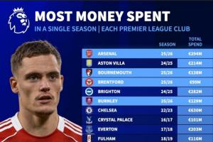 阿森纳、伯恩茅斯、布伦特福德、伯恩利、利物浦、曼联、纽卡、诺丁汉森林、桑德兰共9支球队都已创造了各自球队单赛季引援花费的历史纪录。