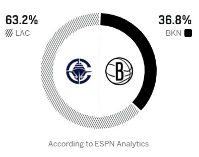 ESPN预测本场比赛胜率:快船63.2%,篮网36.8%。